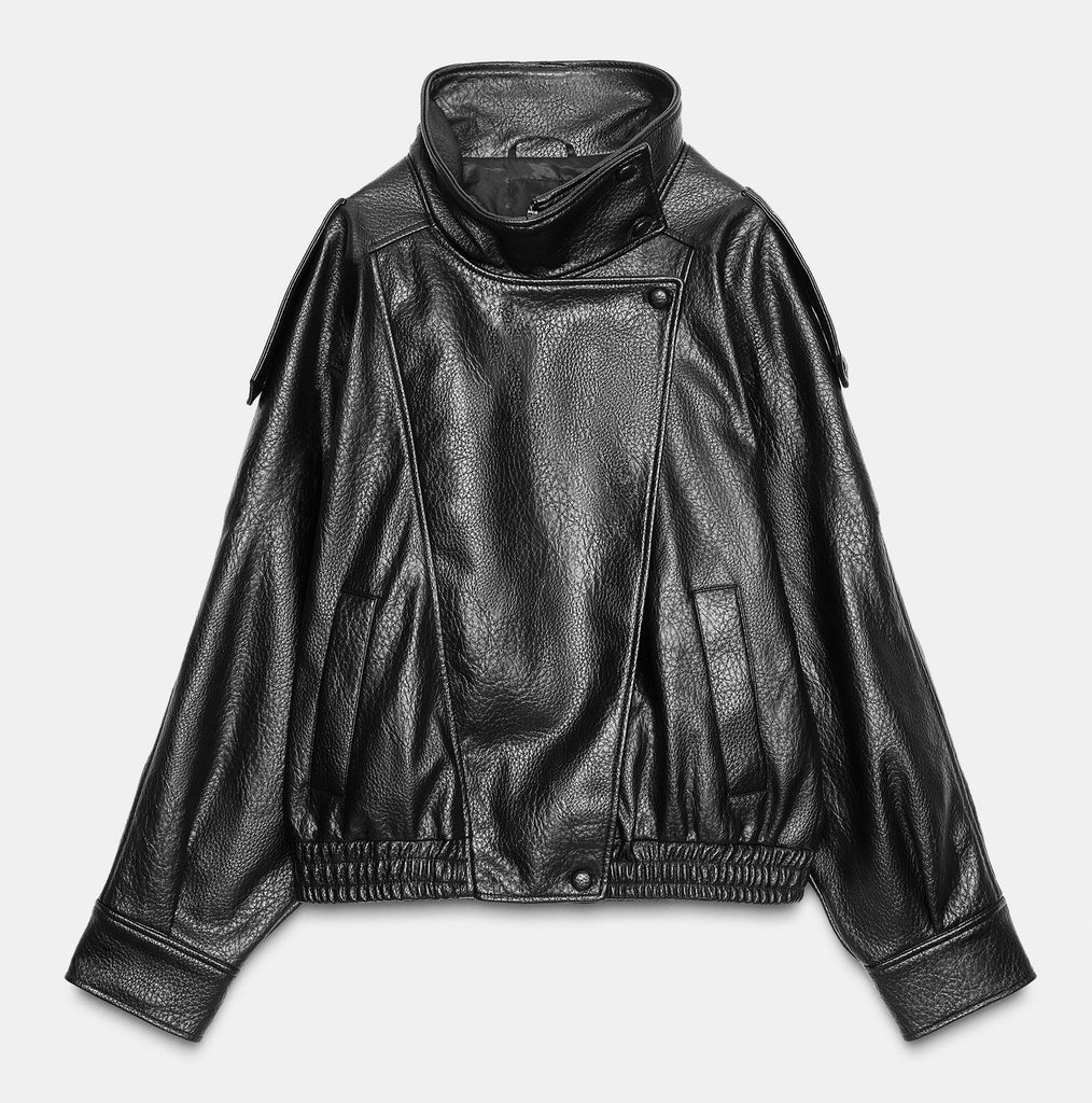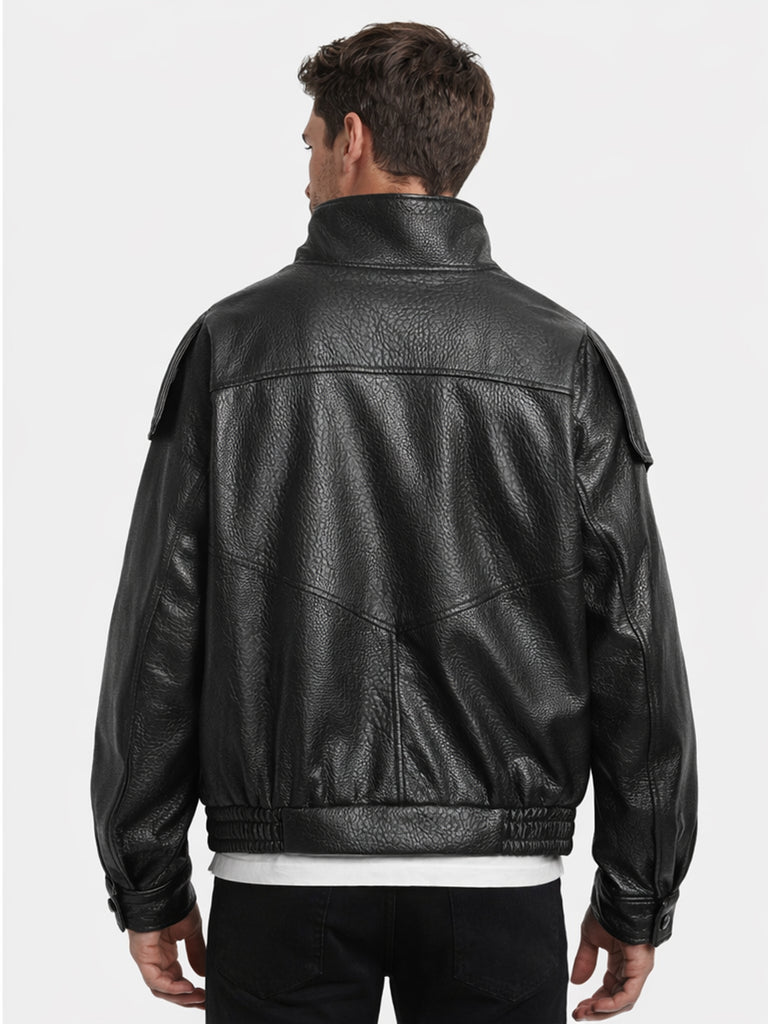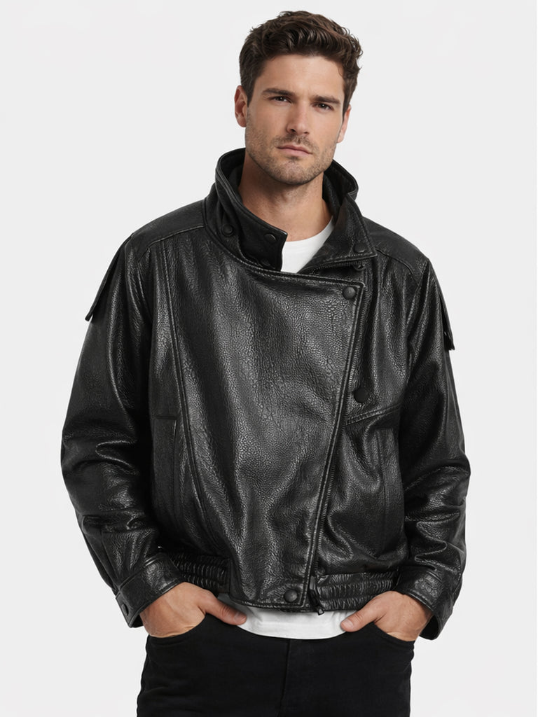 Elevate your wardrobe with this sophisticated black leather jacket, featuring a distinctive funnel collar that delivers contemporary style with timeless appeal. Crafted from premium leather with a refined textured finish, this piece combines durability with refined aesthetics. The structured funnel collar provides a modern silhouette while offering practical neck coverage. Designed for both men and women, this versatile jacket transitions seamlessly from casual outings to elevated occasions. The quality leather construction ensures longevity, making it a worthwhile investment in your essential outerwear collection.