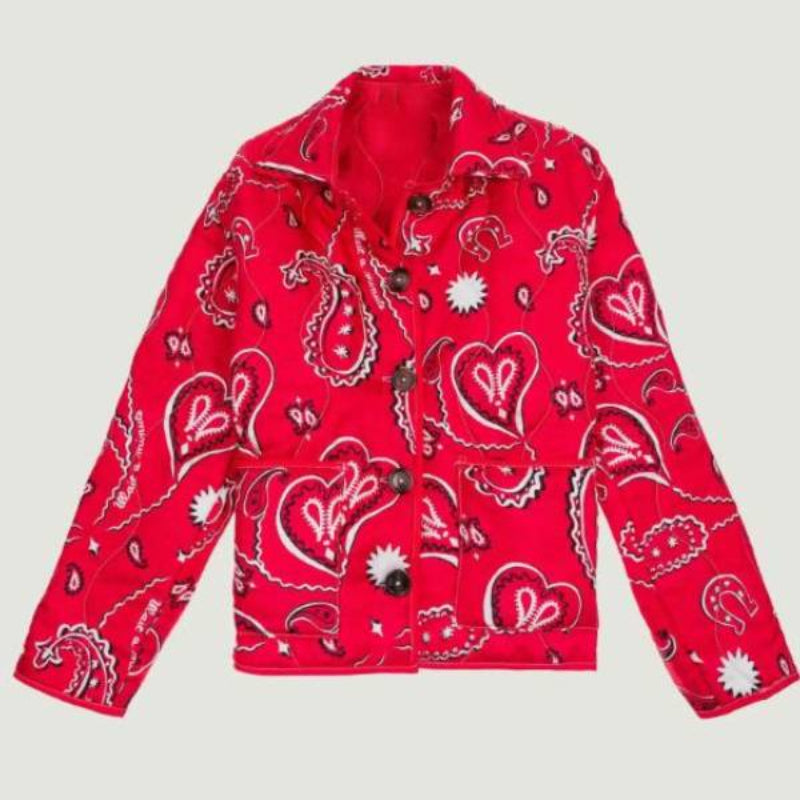 Embrace the unexpected with this striking Red and White Paisley Patterned Blazer (also seen as a jacket or shirt-jacket) straight from Emily Cooper's bold wardrobe in the latest season of Emily In Paris. This piece flawlessly marries classic French style with a playful, Western-inspired bandana print featuring charming heart and horseshoe motifs.