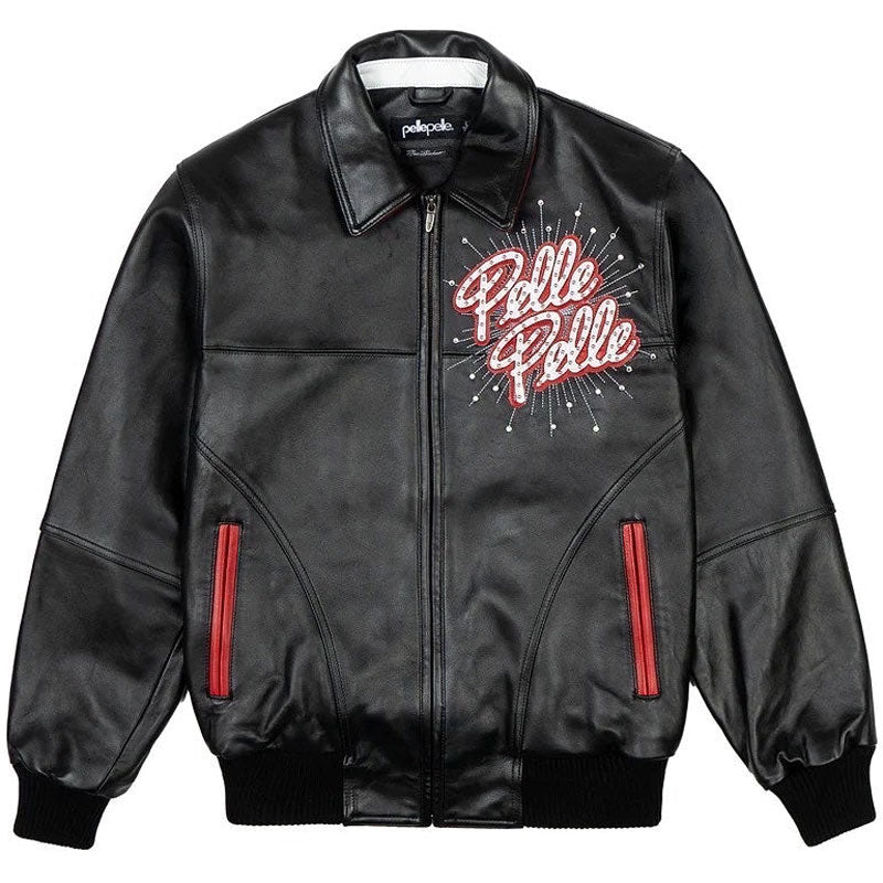 The front is cleaner, balancing the bombastic back with signature details: a simple, stylish script Pelle Pelle logo over the chest and striking red piping accents on the welt pockets, adding a pop of color that hints at the main design.