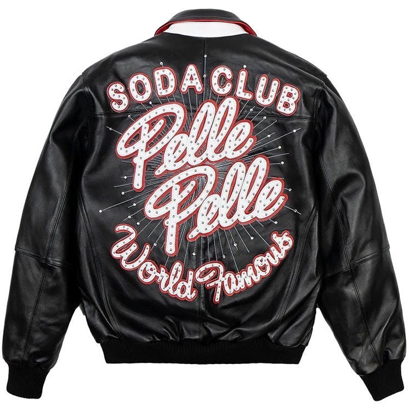 The design is centered around the spectacular, iconic back graphic, featuring a massive, show-stopping "SODA CLUB Pelle Pelle World Famous" motif. This elaborate embroidery utilizes heavy white stitching and meticulous studding to brilliantly replicate a vintage neon sign glowing against the deep Black Leather canvas. It’s a bold, celebratory statement of the brand's global recognition and street dominance.