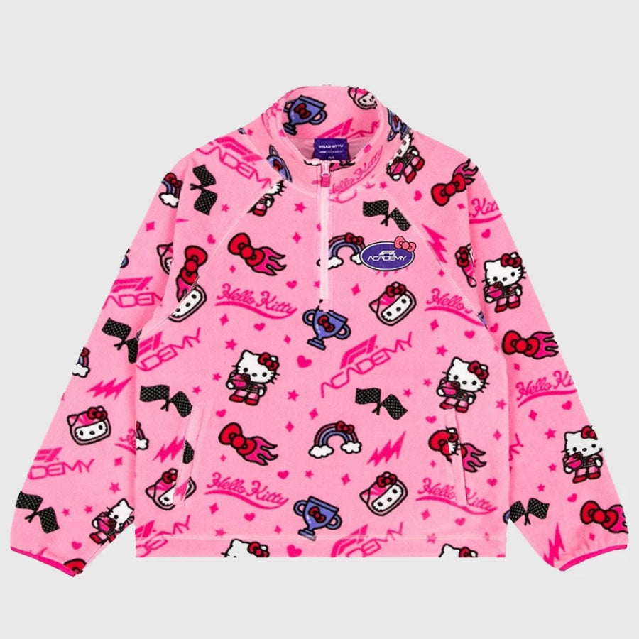 Unleash your inner racing enthusiast and embrace adorable pop culture with this exclusive Unisex Formula 1 Academy Hello Kitty All Over Print Velvet Jacket. This vibrant, eye-catching piece perfectly blends the fierce world of Formula 1's groundbreaking all-female racing series, F1 Academy, with the timeless charm of Hello Kitty. It’s the ultimate statement jacket for fans who live life in the fast lane while keeping things cute and cozy.