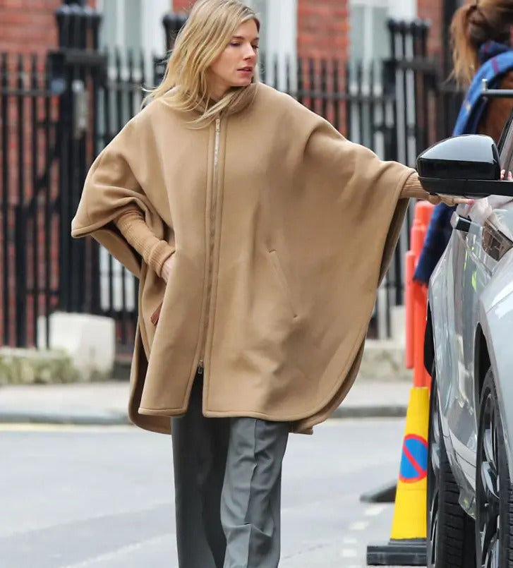 Inspired by the very beautiful and charming, Sienna Miller, who appeared in the very renowned Netflix series, Anatomy of a Scandal, the Sienna Miller Poncho is a chic attire for any event, be it a ball or a casual evening out with your folks. Coming to its specifications, the flamboyant Anatomy of a Scandal Sienna Miller Poncho is made of genuine quality wool material which is blended remarkably, giving it a smooth touch. With an internal viscose lining, the Sienna Miller Tv Series Anatomy of a Scandal 2022 Sophie Whitehouse Brown Wool Poncho is made comfortable and easy to wear for long hours throughout the day! The adorable Sophie Whitehouse Brown Wool Poncho can be your go-to attire anytime! It can be pulled off with the same colored high boots effortlessly! Having a zippered style front closure, the Sienna Miller Brown wool coat has got a stand-up styled collar and covers full of your arms. Its creamy brown color gives the apparel an elegant and decent touch. The cherry on the top is its cost-effective price range. Now, the apparel is available with free shipping and a secure payment plan. You can snap up this flamboyant piece of work at the most reasonable price on our website. So what are you waiting for? The elegant Sophie Whitehouse Anatomy of a Scandal brown wool poncho is just a click away. Order your favorite Sienna Miller Sophie Whitehouse Brown Wool poncho right away and get it delivered right to your doorsteps without a hassle! Happy shopping!